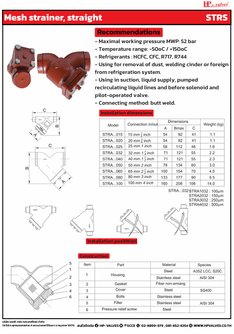 Suitable for suction lines, liquid supply lines, pumped recirculating liquid lines, and installation before solenoid and pilot-operated valves
